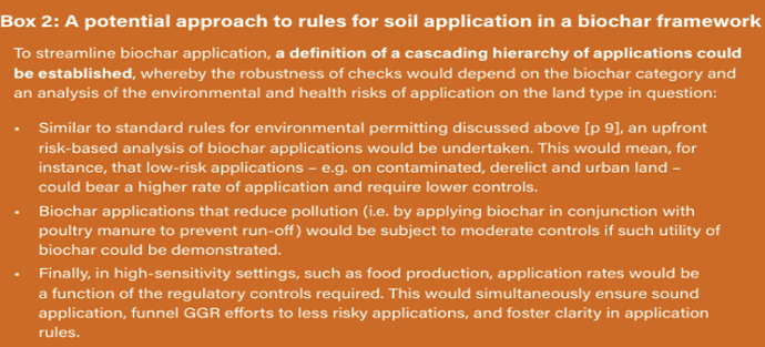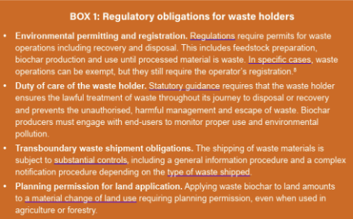 The realization of the aforementioned test entails considerable transaction costs in the absence of standards apart from voluntary guidelines within a framework shaped by case-specific evaluations. Processes and regulatory requirements pertaining to waste in the UK are ambiguous and vary across UK jurisdictions, which may lead biochar to attract less attention as a GGR method.