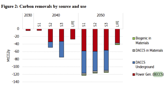 - The modelling studies conducted by the European Commission regarding the steps that should be taken for decreasing the net amount of greenhouse gas emissions by 90 % until 2040 attach importance to permanent CDR methods including BECCS. Accordingly, by 2040, BECCS is anticipated to reach a stage where it can remove up to 33 Mt of CO2 annually. The estimations for the use of BECCS together with Direct Air Carbon Capture and Storage (DACCS) vary between 16 MtCO2 (S1 scenario) and 155 MtCO2 (S3 scenario), remaining within a range between 0.3% and 3.3% of the greenhouse gases emitted by the EU in 1990.