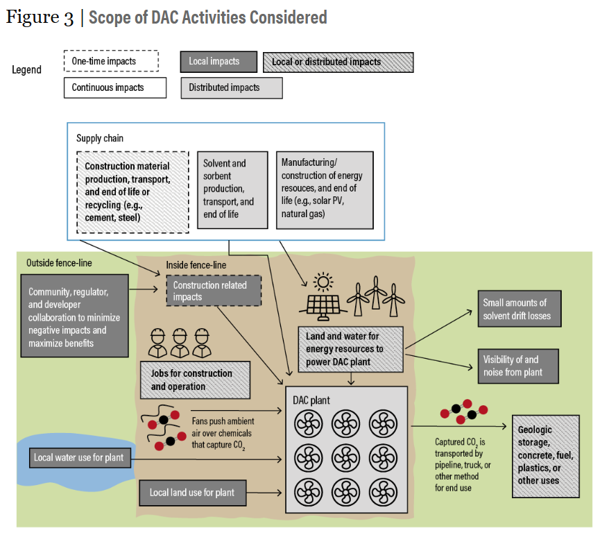 - That said, given that DAC is a novel technology and its effects vary depending on the implementation strategy, evaluations should be made for every activity separately to comprehend anticipated environmental and social repercussions compared to other industrial projects or a scenario where no DAC activity takes place.