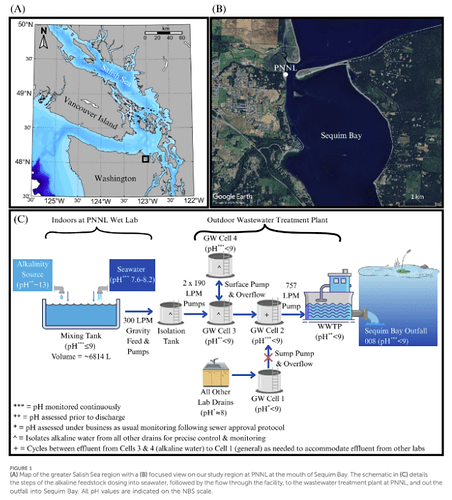 This study reports a small-scale field trial in which electrochemically-derived alkaline seawater was discharged into a coastal outfall in Sequim Bay (Washington State, USA) via a wastewater-treatment plant line. The goal was to test the feasibility of ocean alkalinity enhancement (OAE) for marine CO₂ removal by increasing seawater pH and alkalinity. The experiment showed that pH at the outfall‐adjacent sensors rose from around 7.5–7.7 baseline to peaks near 8.3 during the pulses, while other water quality parameters (temperature, salinity, oxygen, turbidity) remained essentially unchanged. Although the alkalinity signal diluted rapidly (within a few meters), the proof-of-concept of controlled alkaline discharge was shown. The authors conclude this demonstrates the technical viability of a conservative OAE release and provides a basis for up‐scaling further trials.