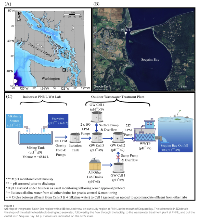 This study relies on a novel electrochemical generation method (via bipolar membrane electrodialysis) to produce aqueous alkalinity from seawater, which is then discharged back into the ocean, differently from most previous studies focusing on solid alkaline materials (e.g., minerals) or brines. Bringing together industry, academic, and federal partners, this study provides a real-world demonstration of coastal outfall deployment through an integrative “lab-to-sea” setup linking OAE with infrastructure integration and regulatory compliance.