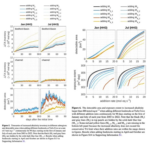 This paper advances OAE research by explicitly confronting the operational trade-offs between making alkalinity additions measurable and ensuring that the process doesn’t create harmful spikes in chemistry or prolonged exposure for marine ecosystems. While past work on OAE has largely focused on theoretical carbon uptake or global-scale impacts, this study is novel in integrating a high-resolution regional ocean model with dissolution and transport processes, enabling realistic simulations of how different alkaline materials disperse, dissolve, and persist in a real coastal setting. The research pivots away from idealized, large-scale projections and moves toward practical MRV considerations, which are critical prerequisites before any large-scale or regulatory-approved OAE activities can occur. By explicitly quantifying detectability and exposure, the authors contribute a much-needed framework for comparing deployment scenarios informed by both physical oceanography and measurement science.