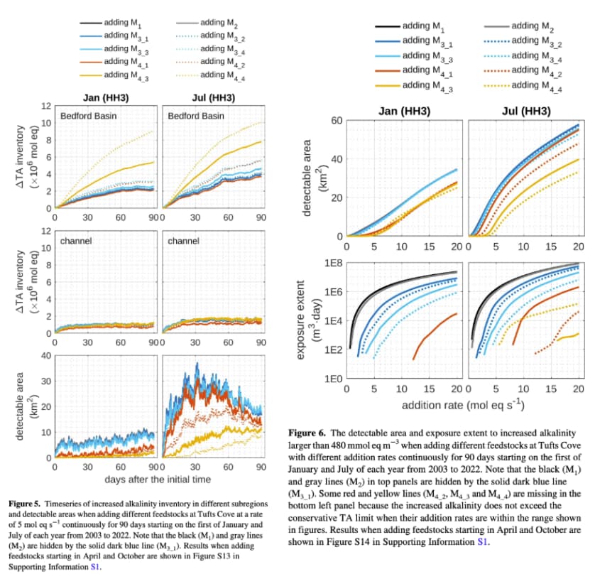 The modeling results reveal several key patterns. Detectability of added alkalinity — crucial for MRV — increases the longer the residence time of water in the target area. In practical terms, this means that additions made in summer, when waters remain in the region longer, are easier to measure than those in seasons with stronger flushing. However, this same condition also raises exposure risk, as elevated alkalinity lingers and potentially impacts local chemistry or organisms. The study finds that one can mitigate exposure without sacrificing detectability by selecting feedstocks with solubilities tuned to the seasonal circulation regime and by distributing additions across multiple sites to prevent localized accumulations. The authors thus provide computed optimal allocations of dosage, season, and feedstock that meet detectability objectives while staying within regulatory and safety constraints, underscoring the need for location-specific, context-aware planning in OAE deployment.